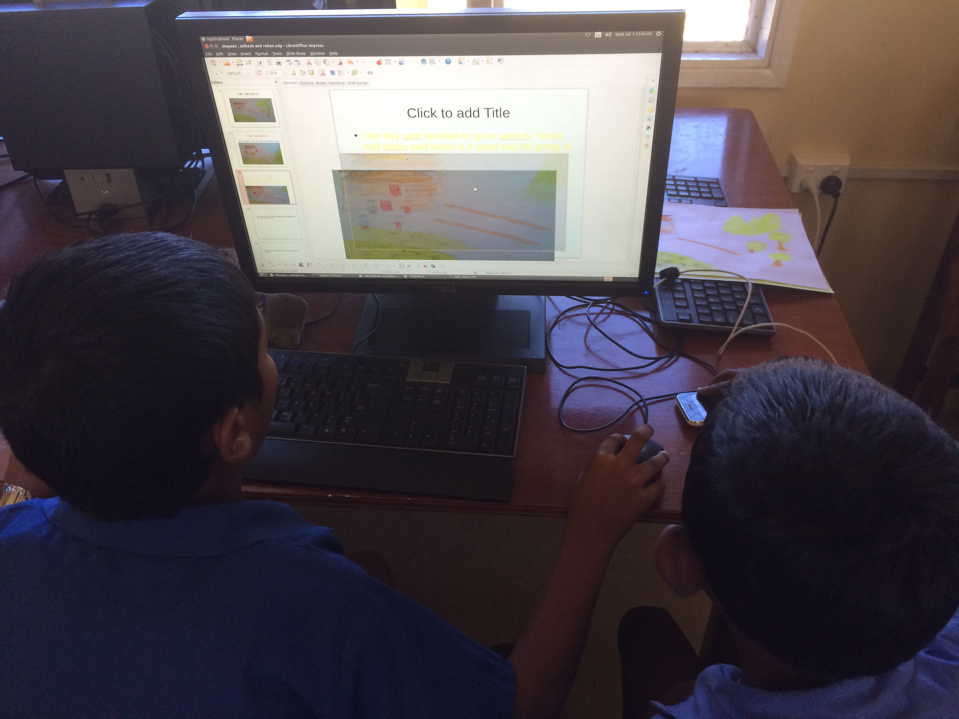 The first training sessions covered basic use of the computer hardware and how the Edubuntu system worked. They also went through some pre – loaded programs like Tux Math, Tux Typing and Tux Typing to get the teachers started. The teachers were showed how to access programs in Libre office. This is a powerful office suite that includes: Writer (word processing), Calc (spreadsheets), Impress (presentations), Draw (vector graphics and flowcharts), Base (databases) and Math (formula editing). Most of the time was spend on word processing. Teachers also had the chance to explore the educational potential of Scratch that can be used to create games and a range of other digital artefacts. A highlight was showing teachers how to access and develop research activities with the SEE box.