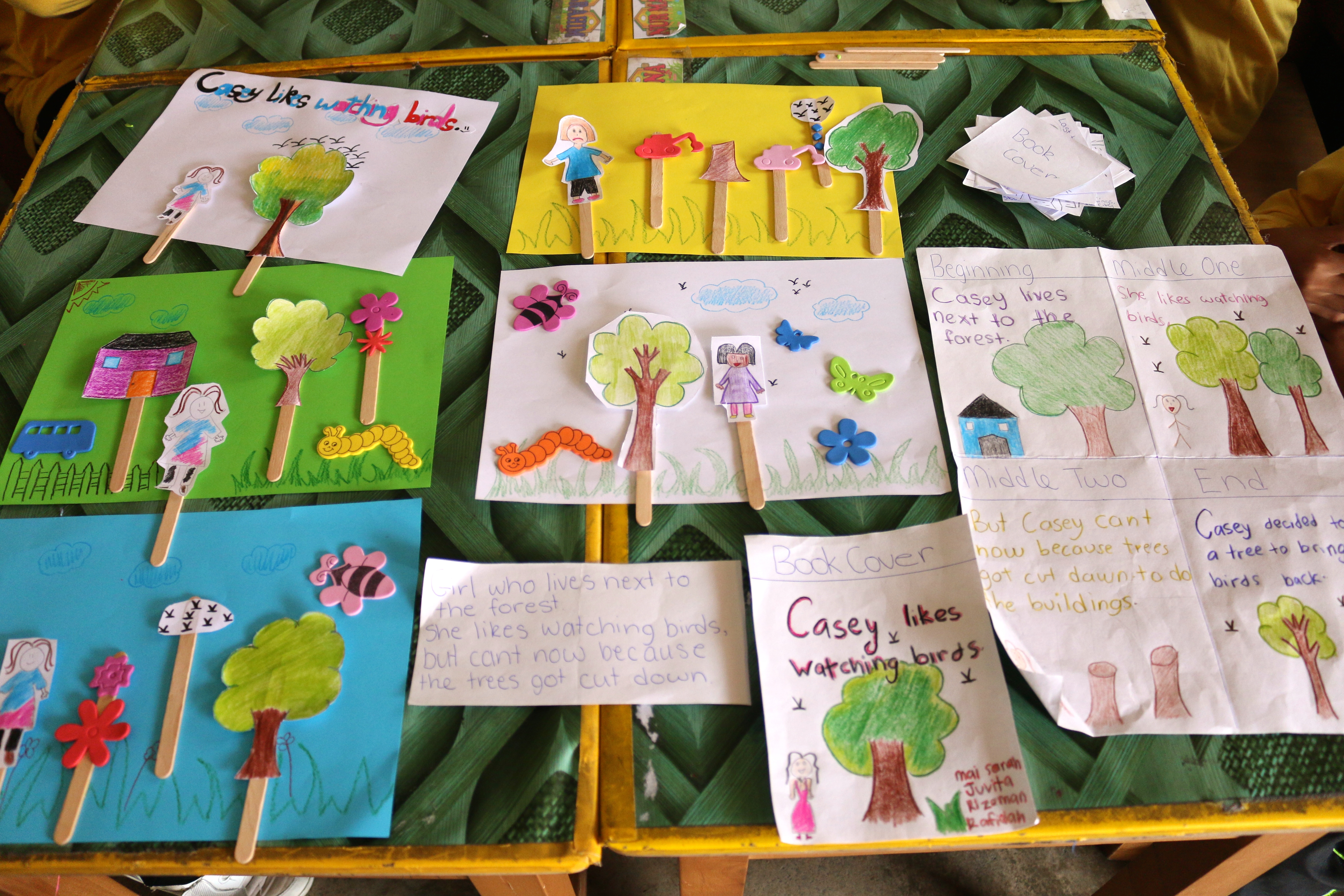 Our lesson plan included a combination of the narrative structure of stories, deforestation, and movie making. The result saw the children create their own story based on the theme of deforestation with which they created a movie clip, using drawings, popsicle stick characters and a voice recording. They edited their films with the program Open Shot by syncing the pictures to the voice recording and adding transitions.