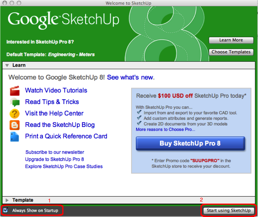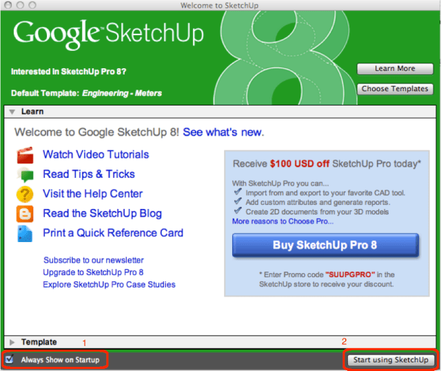 - When you open the program, you will see the following page. You can un-tick(1) if you do not want to see this window all the time. Click start using the program(2). When opening the program for the first time, you will be asked to choose a template. Choose one that allows you to measure in metres.