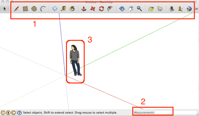 The important aspects of the next page are: (a) toolbars(1) – this enables users to create their models; (b) measurement box(2) – this gives dimensions of measurements, and (c) clipart (lady) – she gives an idea of the perspective. It can be deleted by scrolling the mouse over it and then hitting the delete button.