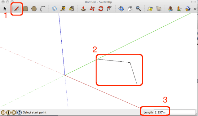 The LINE tool(1) can be used to draw lines(2). Notice that you keep track of the measurement associated with the lines in (3). They can be join to draw 2 and 3D shapes.