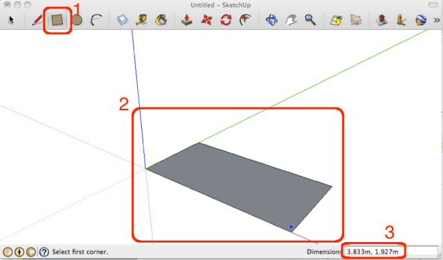 The RECTANGLE(1) tool makes rectangles(2). In this case a rectangle has been made which measures – 3.833m by 1.297m (3).