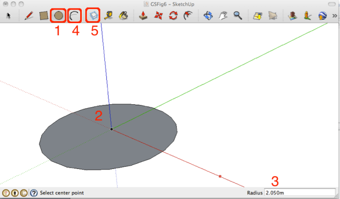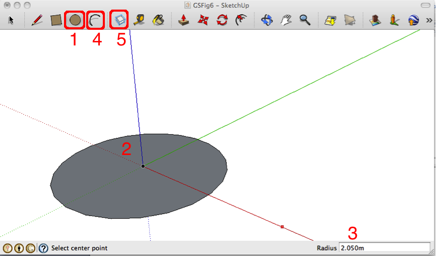 Circles(2) can be drawn with the CIRCLE (1) tool. In this case, a circle with a radius of 2.050m had been drawn. The ARC (4) tool draws arcs.