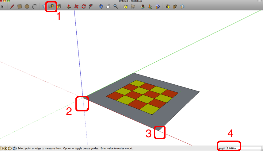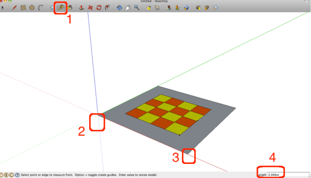 The TAPE MEASURE(1) tool is very handy for measurements. To measure a side, click the tape Measure Tool at the start(2) and move cursor along to the end point(3).The measurement is shown in measurement box.(4)
