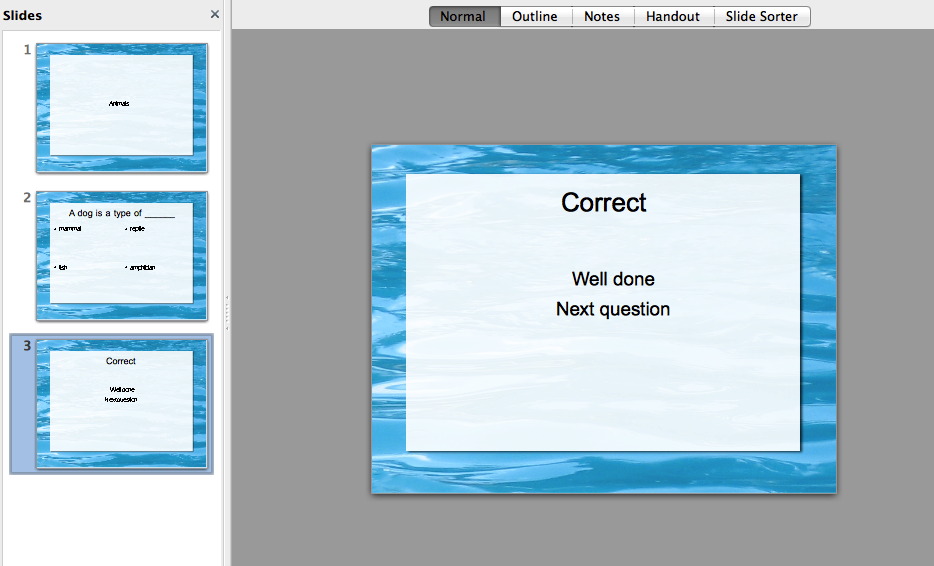 So for each question, there has to be a slide for the correct response and a slide for the incorrect responses.- Now the next question slide can be created.