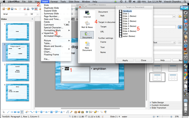 The steps that were followed with the correct answer i.e Steps 5 and 6 need to be followed here as well. Each time any of the incorrect responses are clicked, the Sorry slide(above) or Slide 4 should appear. So the steps are – Select an incorrect response(1), click Insert(2) in the menu bar, from here choose Hyperlink(3), followed by Target in document(4) and then Slide(4).