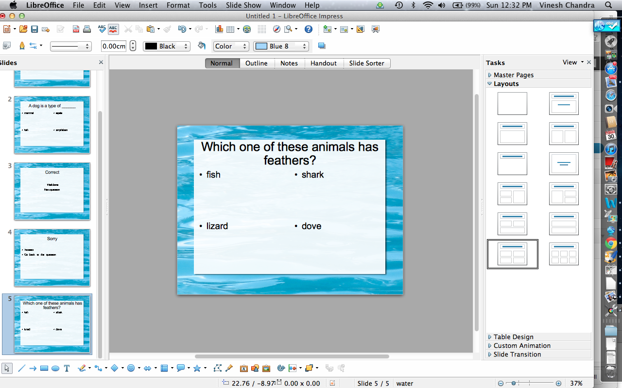 Presentation in Libre Office can be used to create quizzes. Microsoft PowerPoint can also be used for this purpose. While making a good quiz can take time, once created it can be used over and over. It can also be shared with other teachers. Therefore the work load and the time required is shared. The following steps outline the process. You can make the activity as interesting as you want by embedding audio and video in your slides.