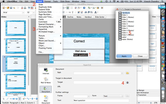 To direct the student to this slide, the go to the Next Question option (see Step 4 above) needs to be hyperlinked to it – in the same way we have linked other slides. The first step is select Next Question(1), then Insert(2). From here choose hyperlink(3), then Target(4). The target chosen is Slide 5 (5) because this is the slide for the next question. Once done, choose apply and close on the Target in Document and Hyperlink documents.